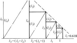 例 数列中,前两项之和等于紧邻后一项的数值,构成的比例(又称费波那齐级数):